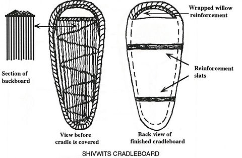 CRADLEBOARDS Koanonts'. The Paiutes had their own styles of cradleboards. They are called koanonts'. They came in very handy in the old days when the bands were migrating and at many other times. They are still popular today among the Paiutes and have not outlived their usefulness. The cradleboard allowed a woman to carry her baby on her back while traveling so her hands would be free to carry other things. When a woman was out harvesting seeds and berries she could take her baby with her in the cradle to lean up against a tree so the baby could watch what was going on. If the cradle fell forward the hood or visor protected the baby from falling on its face. The hood also kept the sun out of the baby's eyes and could be covered with a light blanket to keep flies off a sleeping baby's face. The cradle could also be hung from a limb to let the wind rock it. The cradleboard serves as an excellent bed on cold winter nights so the arms can remain covered and the baby cannot kick off the blankets. On warm nights the arms can be left out. The snugness of being wrapped in a cradle gives the baby a sense of being held, loved, and helps them grow up with a straight posture. They are never left tied in the cradle all the time, but only at night and at other times when the baby wants it or it becomes handy to do so. Babies do become accustomed to them and often won't go to sleep until they are put in one.